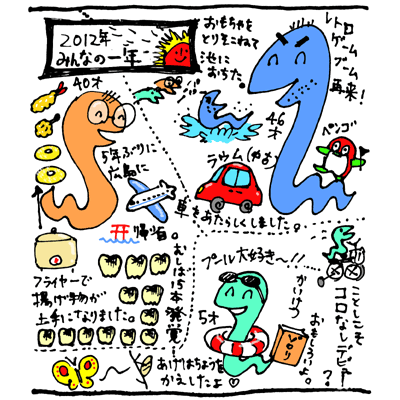あけましておめでとうございます。本年もよろしくお願いいたします。昨年の仕事を引きずりつつ迎えた新年。 明けてしまったものは仕方がないので、今年も家族で 近所の神社 へ初詣。 御籤は中吉。「吉報は耐えて待て」的な事が書かれておりました。 昼過ぎから大ばぁばの待つ叔母の家へ。恒例の初顔合わせ。 今年は息子のハトコが1人増えました。生後2ヶ月。ちっちゃ〜!(^^ 皆様にとって、勿論自分たちにも良い年になりますよう。 ※ 右は相方の描いた年賀状。クリックで拡大表示されます。 これより以前の徒然は 2012年下期 をご覧ください |